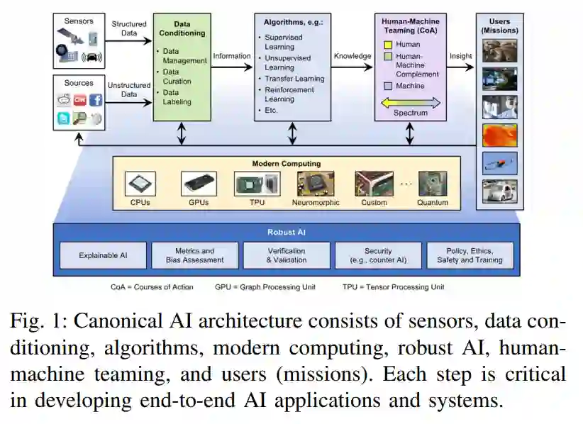 原始数据首先需要进行数据规整,在该步骤中数据被融合、聚合、结构化、累积并转换为信息。数据规整步骤生成的信息作为神经网络等有监督或无监督算法的输入,这些算法可提取模式、填充缺失数据或查找数据集之间的相似性、进行预测,从而将输入信息转换为可操作的知识。这些可操作的知识将会传递给人类,用于人机协作阶段的决策过程。人机协作阶段为用户提供有用且重要的洞察,将知识转化为可操作的智能或洞察力。