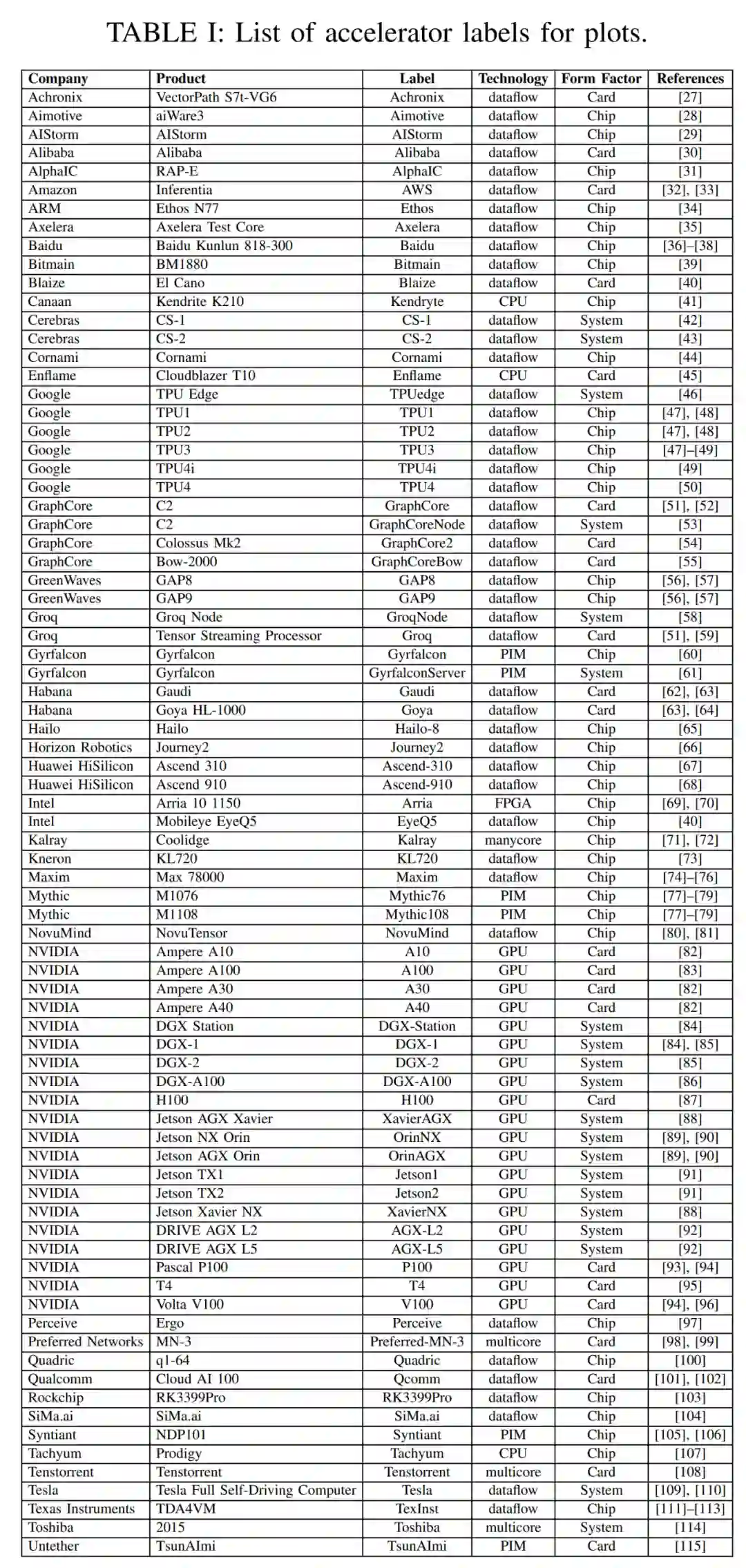 目前,已经有很多探讨 AI 加速器的论文。如本系列调查的第一篇论文就有探讨某些 AI 模型的 FPGA 的峰值性能,之前的调查都深入覆盖了 FPGA,因此不再包含在本次调查中。这项持续调查工作和文章旨在收集一份全面的 AI 加速器列表,包括它们的计算能力、能效以及在嵌入式和数据中心应用中使用加速器的计算效率。与此同时文章主要比较了用于政府和工业传感器和数据处理应用的神经网络加速器。前几年论文中包含的一些加速器和处理器已被排除在今年的调查之外,之所以放弃它们,是因为它们可能已经被同一家公司的新加速器替代、不再维护或者与主题不再相关。