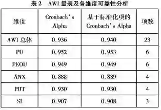 本研究选用克伦巴赫系数来检验量表的内部一致性。对AWI量表各维度进行信度分析,见表2。AWI量表及其内部各维度Cronbach’sα系数在0.889到0.953之间,说明AWI量表具有较高的可靠性。