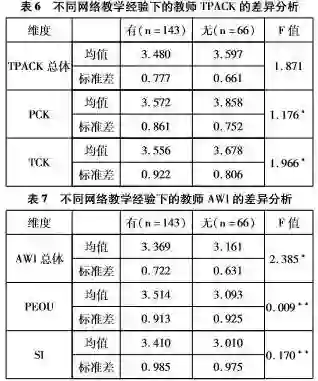 3.教龄、网络教学经验是教师TPACK及网络接受度AWI的重要影响因素