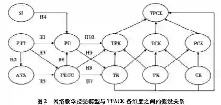 本研究希望从网络教学接受度这一角度出发,探究教师对网络教学的技术接受度与其TPACK各维度水平之间的相关关系,以及网络教学接受度的影响因素与网络教学接受度的因果关系。通过对多个变量之间关系的探究,找到网络教学接受度与TPACK水平间相对复杂的影响关系,理清网络教学接受度对TPACK水平的影响脉络,若能够切实验证网络教学技术接受度与TPACK的相关关系,则能够从网络教学接受度及其影响因素出发,为教师的TPACK水平的提高找到新的有效的途径。