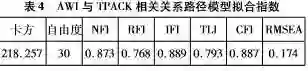 根据本研究所假设的研究模型,在AMOS21.0中绘制出AWI与TPACK相关关系模型。使用AMOS21.0对研究模型进行分析,以最大似然法为模型检验方法,对所有研究对象进行整体分析。表4为AWI与TPACK相关关系路径模型拟合指数。