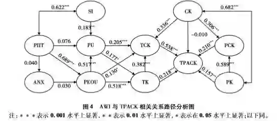 根据分析结果,可得出AWI与TPACK相关关系路径分析图(见图4)。