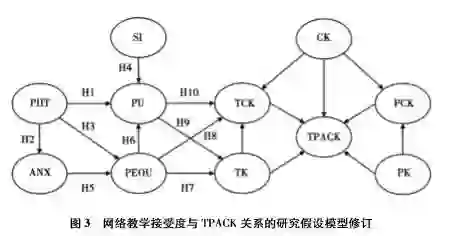 在因子分析部分,TPK维度被降维至TPACK维度之中,因此本研究需对研究模型进行修订,形成如图3研究假设模型。