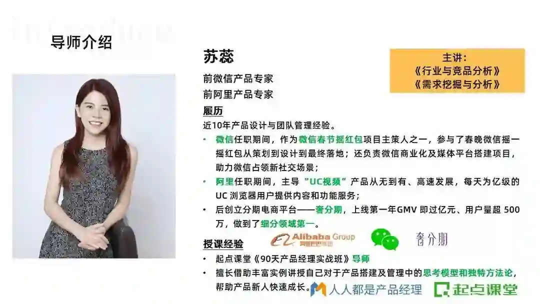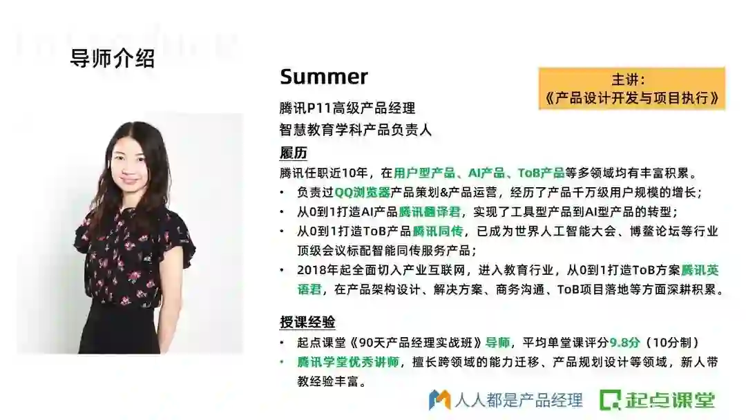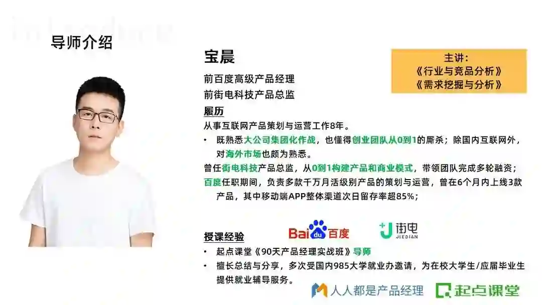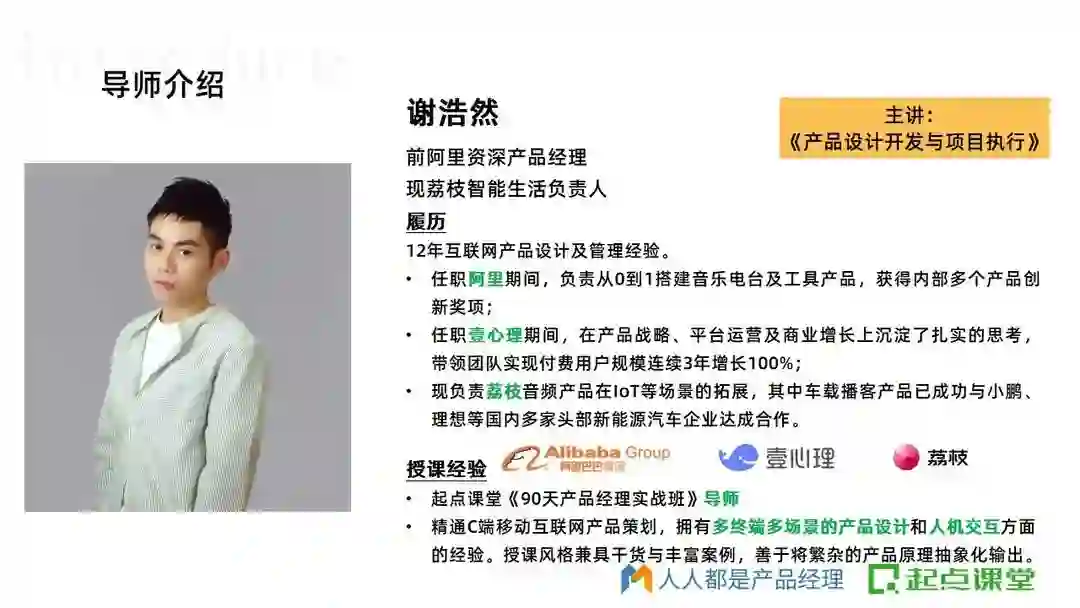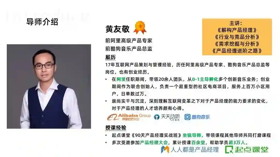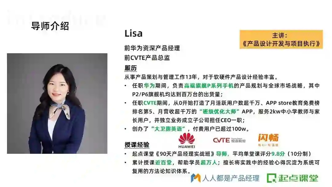 一个行业内靠谱的导师,可以让自己比同龄人少走很多年弯路,90天产品班的导师都来自腾讯、阿里、百度、华为等大厂,平均工作年限在8年+以上,都是久经沙场的老兵,他们不仅拥有多年产品实战经验,而且经历过大厂上亿项目,在课程中能够毫无保留地把他们多年沉淀下来且依然实用的产品方法论传授给大家。