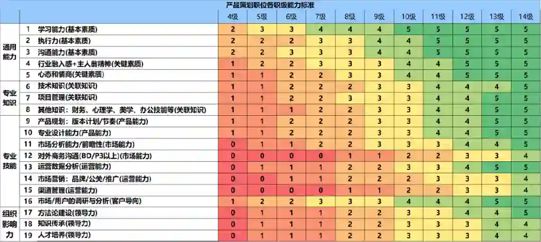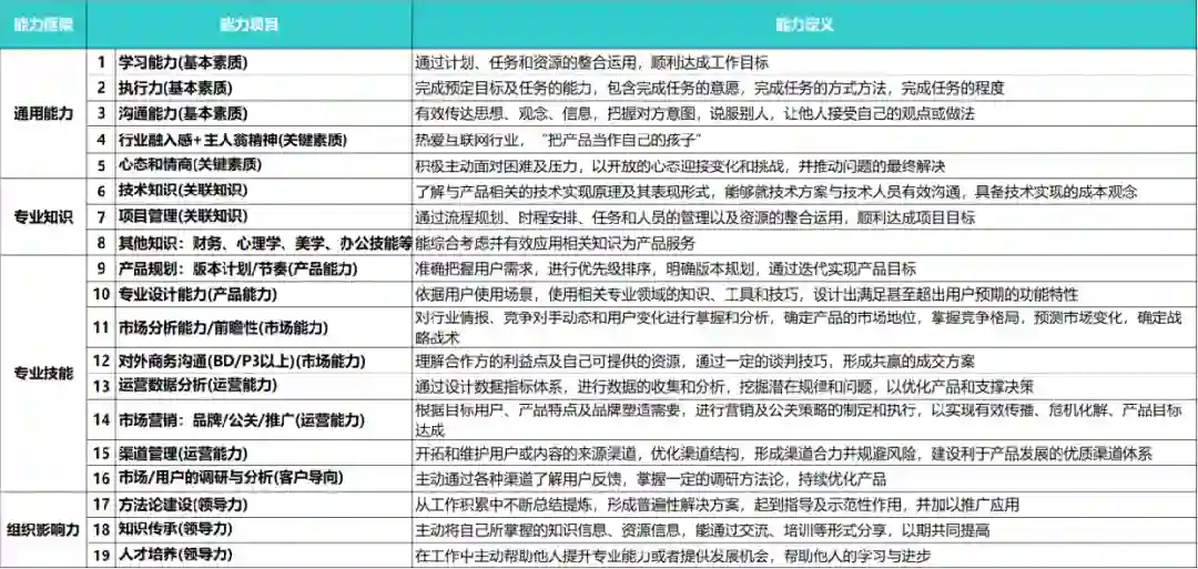 按照《腾讯产品能力模型》要求,对产品经理的能力要求划分为通用能力、专业知识、专业技能和组织影响力4个方面,在此基础上进一步细分出了“项目管理、产品规划、市场调研与用户分析”等18个能力项上,并列出了不同职级所要求的能力标准。
