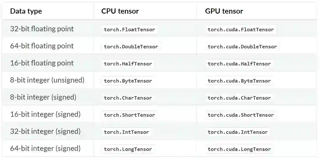 在 PyTorch 中,torch.Tensor 是一种多维矩阵,其中每个元素都是一个单一的数据类型,且该构造函数默认的为 torch.FloatTensor。以下是具体张量的类型: