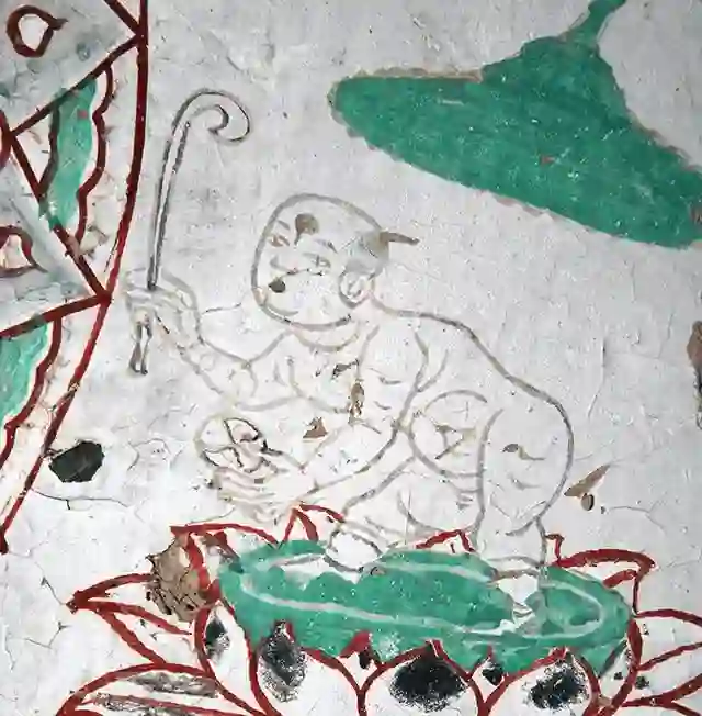emmmm,等一下,这个孩子左手拿着一个圆球,右手持弯头球杖,脚踩莲花,身体作蓄力状,好像在哪里见过。