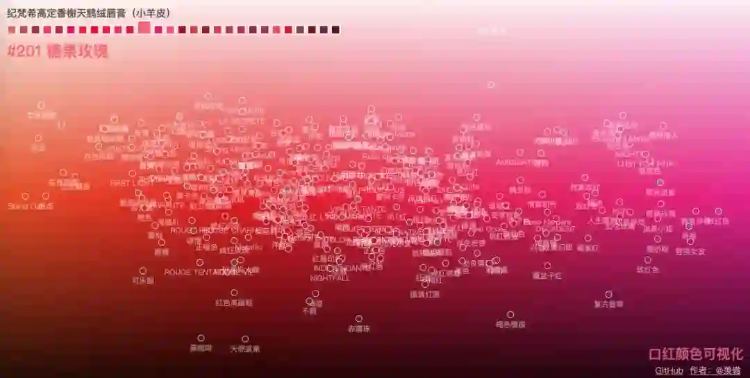 还好,在万能的 Github 上找到了一个宝藏数据库“口红颜色可视化”,这个数据库堪比口红的色号宇宙,不仅囊括了当前最主流品牌的各种系列色号,还很良心的在色盘上排列了出来。