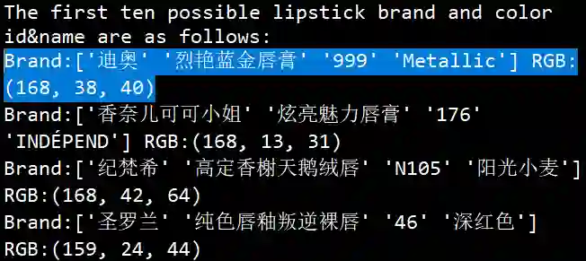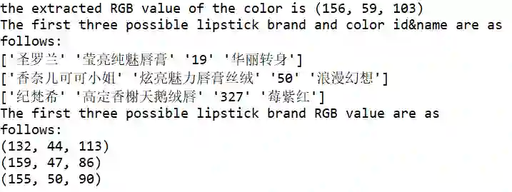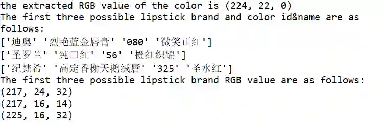实际上是比较 RGB 三个分量维度上的误差,最小的口红输出对应的品牌、系列、色号和 id。