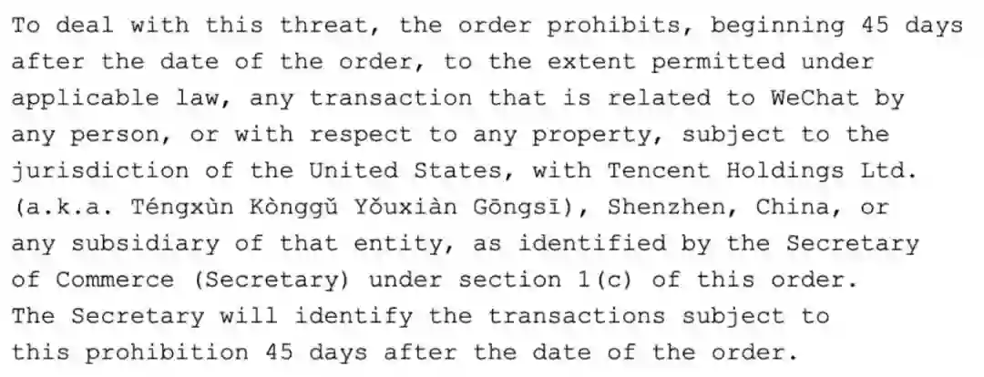 虽然被禁止交易的性质并没有具体明确,但这可能意味着在 45 天之后,任何在美国境内的公民,以及任何受美国法律管制的在美人士,都不得再继续使用微信和 TikTok,否则可能面临法律打击。理论上,用户使用一个 App/ 一项服务,接受其用户条款,就是和其背后的公司达成交易。