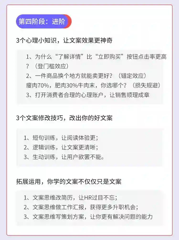 第四阶段将学习心理学方面的知识,学习如何自己修改文案,还将如何将学习文案思维应用在方方面面
