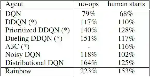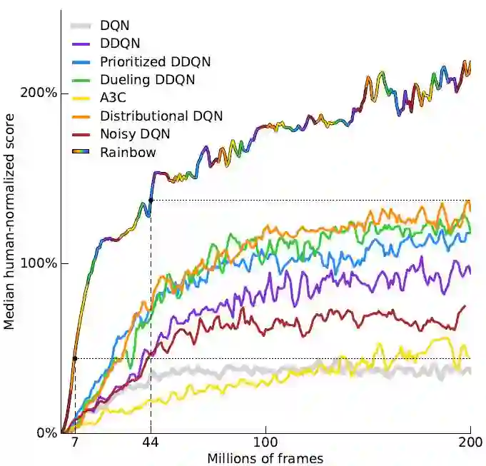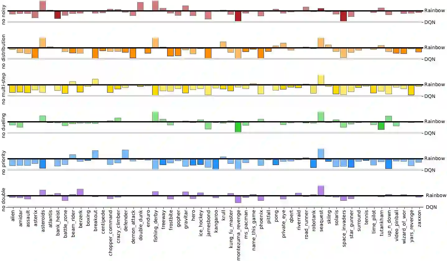 深度强化学习社区对于提升 DQN 算法的性能已经做出过很多种独立的改进尝试。但是,目前我们尚不清楚这些扩展是不是互补的——它们是否可以互相结合?在本论文中,我们研究了 DQN 算法的 6 个扩展,对其组合进行了实证研究。我们的实验组合在 Atari 2600 基准测试中,数据效率和最终表现上都实现了实现了业内最佳水平。我们也提供了详细的研究结果,其显示了每种组件对于总体性能的贡献。