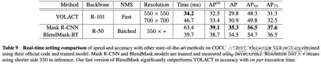 为了跟YOLACT对比,论文改造了一个紧凑版的BlendMask-RT: 1) 减少prediction head的卷积数 2) 合并classification tower和box tower 3) 使用Proto-FPN并去掉P7。从结果来看,BlendMask-RT比YOLACT快7ms且高3.3AP。