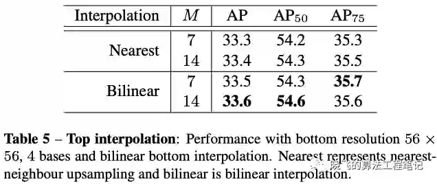 而对bottom-level score maps进行插值时双线性比最近邻高2AP。