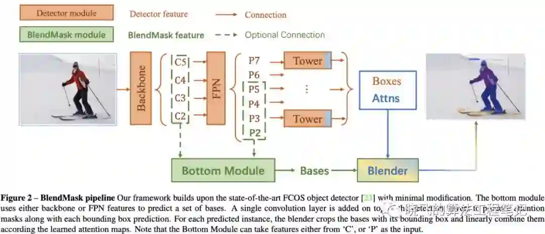 BlendMask包含检测网络和mask分支,mask分支包含3个部分,bottom module用于预测score maps,top layer用于预测实例的attentions,blender module用于整合分数以及attentions,整体的架构如图2所示。