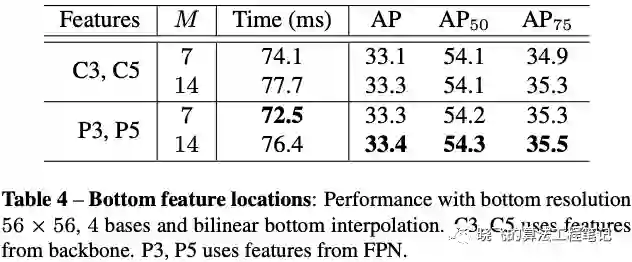 。具体地,使用sampleing ratio=1的RoIAlign,每个bin只采样1个点,Mask R-CNN每个bin采样4个点。在训练的时候,直接使用gt bbox作为proposals,而在推理时,则直接用FCOS的检测结果。