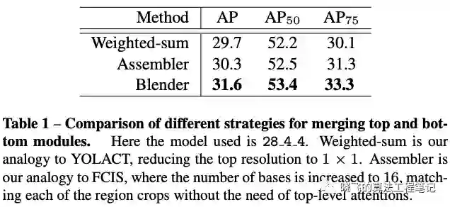 提出了proposal-based的instance mask合并方法,blender,在COCO上对比YOLACT和FCIS的合并方法分别提升了1.9和1.3mAP