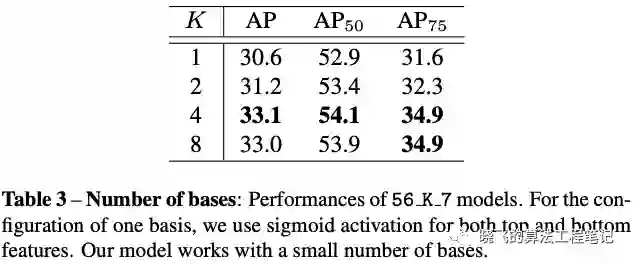 红蓝两个基底分别检测了目标的右上和左下部分点,黄色基底则检测了大概率在目标上的点(semantic mask),而绿色基底则激活了物体的边界,position-sensitive features有助于进行实例级别的分割,而semantic mask则可以对postion-sensitive进行补充,让最后的结果更加顺滑。由于学习到了更多准确的特征,BlendMask使用了比YOLACT和FCIS少很多的基底纬度(4 vs. 32 vs. 49)。