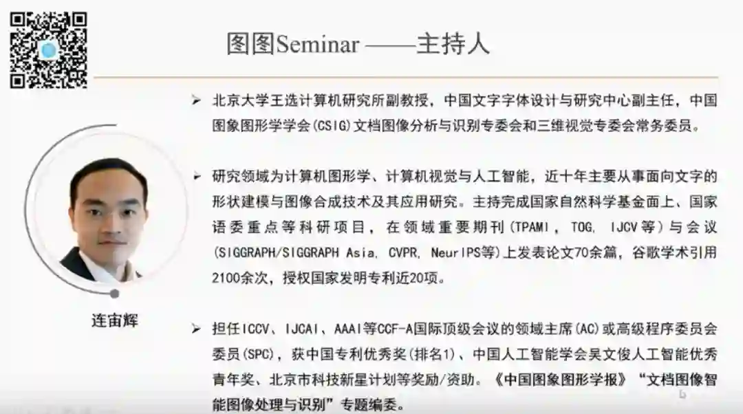 CSIG文档图像分析与识别专业委员会学术微沙龙(简称:文档图像微沙龙)在线学术报告会第十期于2022年7月5日成功举行。本沙龙由中国图象图形学学会主办,文档图像分析与识别专委会发起承办,中国图象图形学报协办。本期活动邀请北京大学王逸之博士分享报告: 面向文字的图形图像生成方法及其应用。微沙龙活动在B站、蔻享学术,中国图像图形学报视频号进行了同步直播。