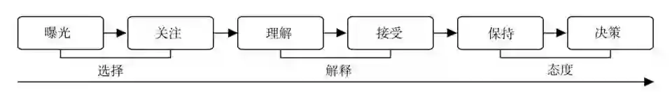 广告的信息接收过程分为三个大阶段,即选择(selection)、解释(interpretation)与态度(attitude),或者进一步分为六个子阶段,即曝光(exposure)、关注(attention)、理解(comprehension)、接受(acceptence)、保持(retention)与决策(decision)。