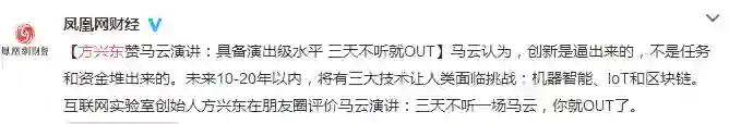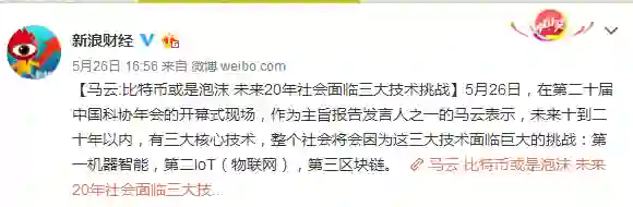 他点评的正是观点中的第三条:第二十届中国科协年会开幕式马云发表的题为《因为相信,所以看见》的演讲。在此次由中国科协和浙江省人民政府联合主办,重科技、偏学术的会议上,马云出席开幕式并发表演讲。马云认为,未来10-20年以内,将有三大技术让人类面临挑战:机器智能、IoT和区块链。对于区块链,马云认为区块链不是泡沫,但今天的比特币可能是泡沫。
