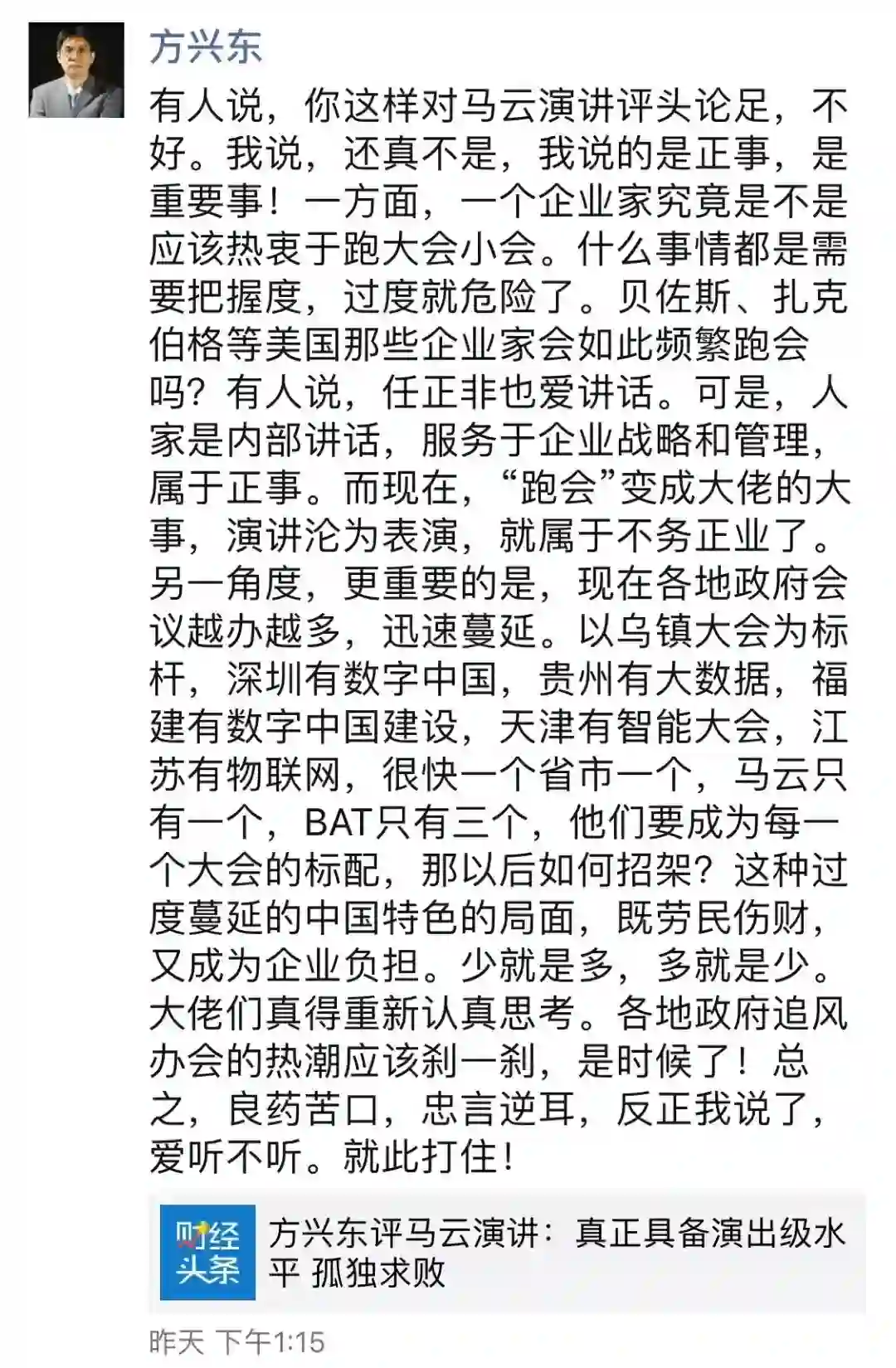 不过,方兴东的观点十分有意思,他咋看之下,似乎是在夸马云。比如说,目前,中国企业家真正具备演出级水平的企业家凤毛麟角,马云可以孤独求败。马云已经网络时代顶级会议的第一标配,没有“马云Inside“,说明这会议就不够档次和份量。 马云的演讲已经能大踏步走出国门,库克、贝左斯、小扎们也成为他衬托……