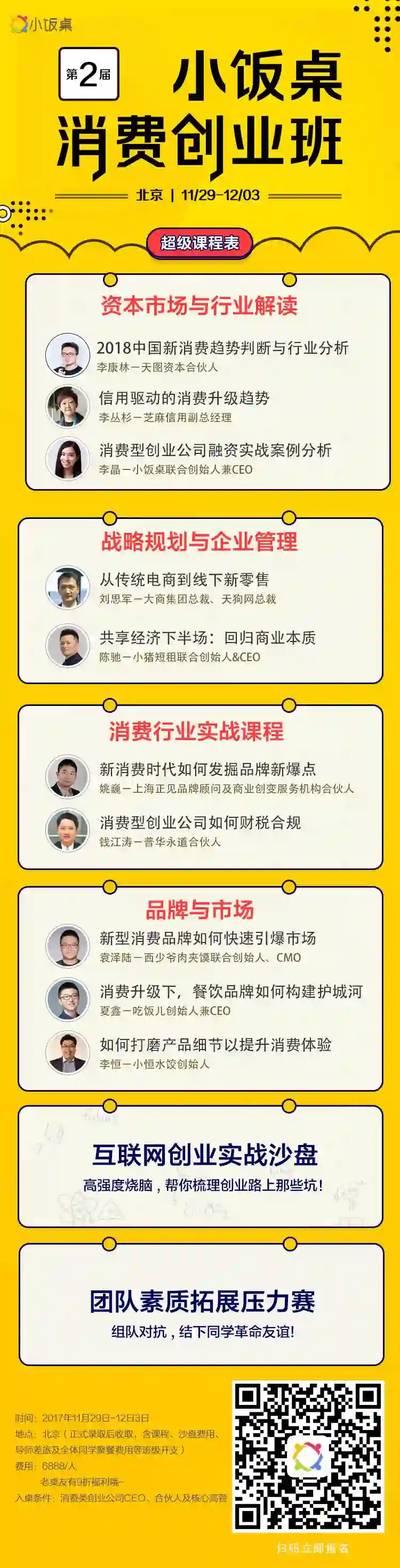 第2届小饭桌消费创业班11月29日重磅开课,在为期5天的课程中,我们邀请到天图资本合伙人李康林、芝麻信用副总经理李丛杉、小猪短租CEO陈驰等十几位大咖导师从商业模式、行业趋势等角度全方位解读消费型创业公司所关心的品牌、用户、供应链、渠道等核心问题。
