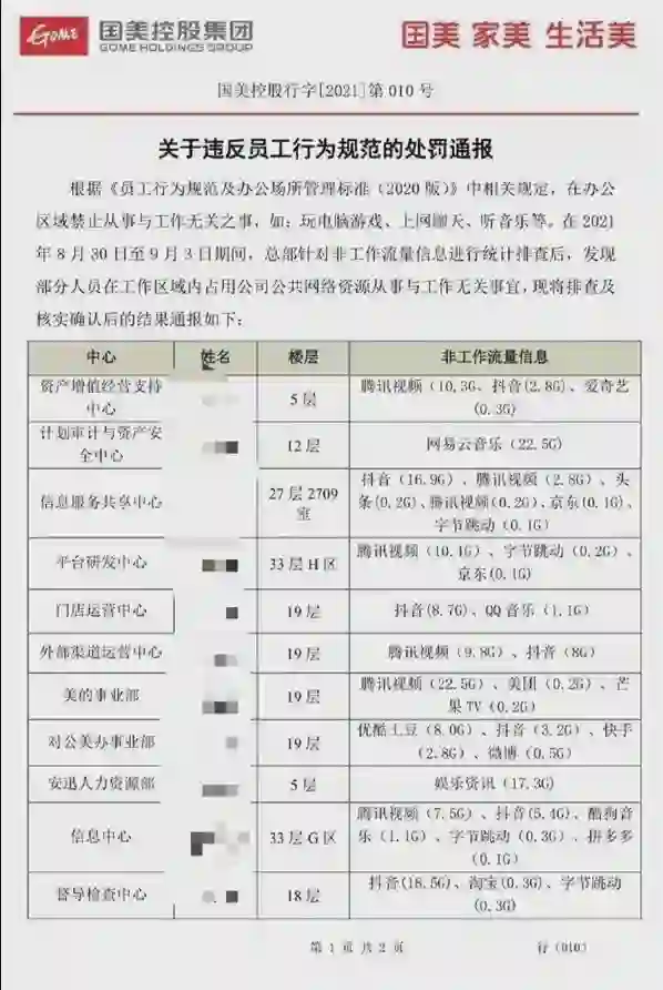 11 月 16 日,网上流传出一份来自国美控股集团有限公司的内部文件《关于违反员工行为规范的处罚通报》截图。该消息一出,在网络上引发热议,有网友表示,员工上网时刻被监控,感觉像监狱。通报文件显示,在 8 月 30 日至 9 月 30 日期间,国美总部针对非工作流量信息进行统计排查后,发现部分员工在工作区域内占用公司公共网络资源从事与工作无关事宜,如:玩电脑游戏、上网聊天、听音乐等。