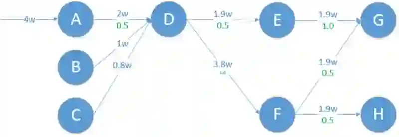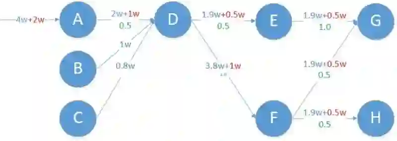图中绿色数字代表传导系数,比如 A 到 D 的传导系数是 0.5。 因为 A 被请求 4w 次每秒,A 就会主动调用 D 服务 2 万次每秒。 有了拓扑图和传导系数,那么就能很容易的根据入口评估出后续服务的请求增量。如图 13, 假如 A 的请求增加 2 万 / 秒的请求量。 那么后续服务将会增加红色字体所描述的请求增量, 见图 14。