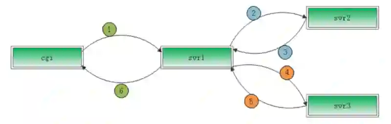 首先来看一个简单的 rpc 调用链场景(见图 7),一个请求通过接入层 cgi 调用下游的 svr1,然后 svr1 先调用服务 svr2,拿到结果后再调用 svr3,最后组合 svr2 和 svr3 的结果,通过 cgi 返回给用户。这里发生了 3 次 rpc,我们用①②③④⑤⑥表示了 RPC 的顺序,怎么做到跟踪还原呢?