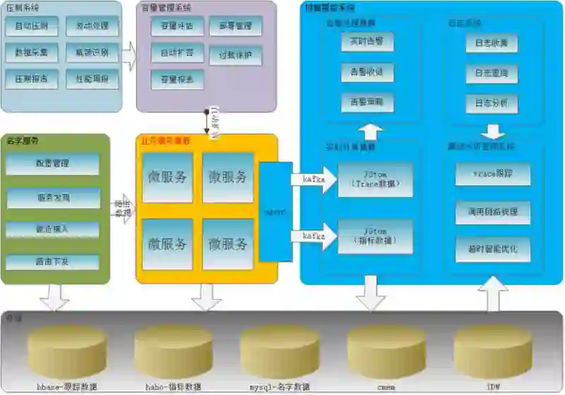 天机阁包含链路跟踪、压测系统、容量管理系统、名字服务四大系统,总体架构见图 6。