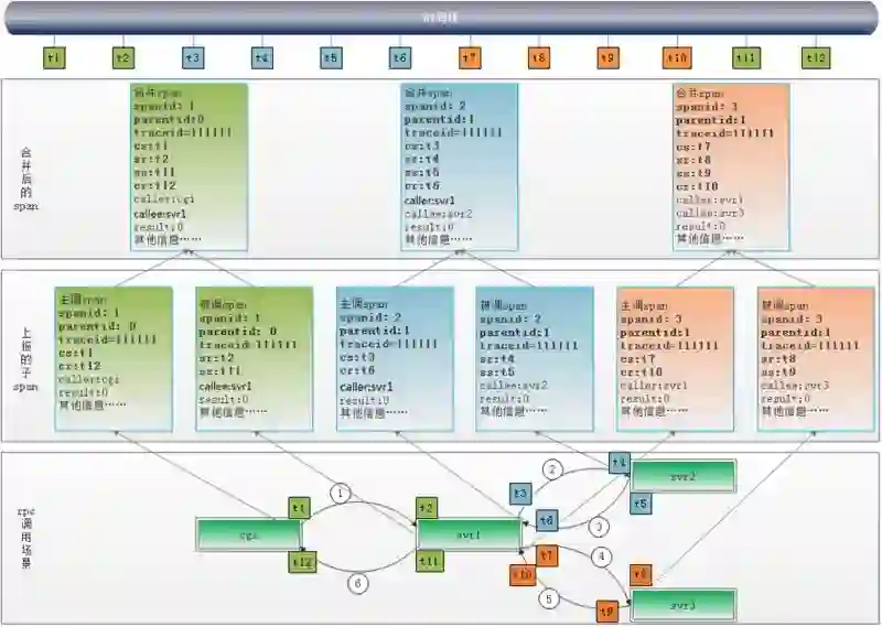 第 1 个子 span:cgi 在发起 rpc 前,生成一个 client span, traceId=111111, spanid=1, parented=0(没有父 span)。并将这 3 个 ID 通过带内数据的方式传递给 svr1。等 cgi 收到 svr1 的回包后,补全 span 的事件时间:cs=t1, cr=t12,并上报主调 span。见图 8 中 cgi 上报的“主调 span”。
