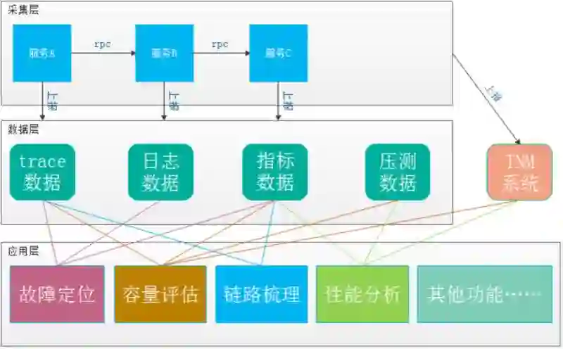 天机阁是一个以分布式链路跟踪为核心的监控系统。它通过采集、存储、分析分布式系统中的“trace 数据”、“指标数据”和“日志数据”,再结合压测数据和 TNM2 数据,实现故障诊断、容量评估以及系统梳理等多种功能,大大降低开发人员的运维挑战, 见图 2。详细数据采集过程见下文“数据采集”部分。