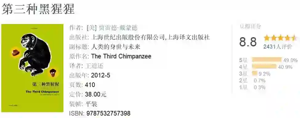 这是一本关于人类早期进化的书籍,书中详细阐述了社会和人类行为的生物学动机。我最欣赏贾 Jared Diamond 的一点是其对于事物的宏观看法。就比如他另一本书,也是我的最爱:《枪炮、病菌与钢铁》,书中采取了一种自上而下的方法阐述错综复杂的主题,全书没有一句废话。
