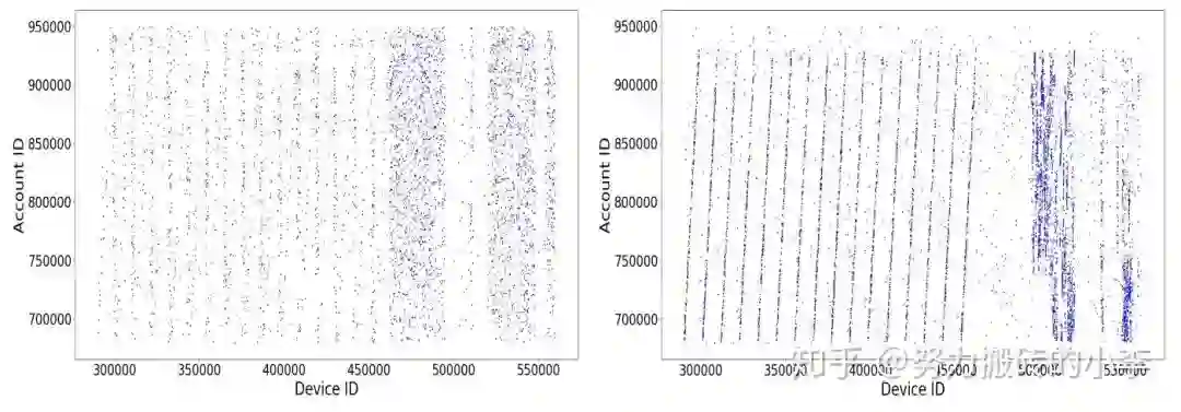 对数据进行分析发现,异常用户往往会有设备聚集性,如果在一个设备上常常会登录大量用户,那么这个设备以及这些账号通常是可疑的。如图所示为正常用户与异常用户的设备-账号id分布,横坐标为设备id,纵坐标为账号id,左图为正常用户,右图为异常用户,可以看出异常用户在某些特定设备id上有较明显的群聚效应。