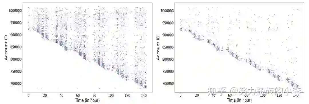 对数据进行分析发现,异常用户往往会有活动聚集性。与正常用户随机时间有行为(登录、注册等)不同,异常用户会集中在某个时间段内集中行动,如图所示为正常用户与异常用户在每个时间点的行为,横坐标为时间,纵坐标为账号,左图为正常用户,右图为异常用户,每个点表示账号i在时刻t有行为,可以看出,异常用户往往行为规律性更强
