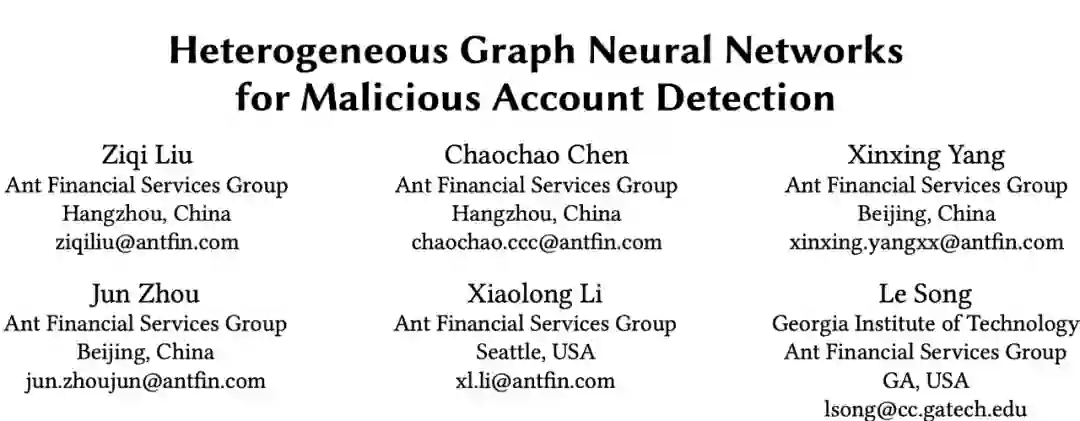 Liu, Z., Chen, C., Yang, X., Zhou, J., Li, X., & Song, L. (2018, October). Heterogeneous graph neural networks for malicious account detection. In Proceedings of the 27th ACM International Conference on Information and Knowledge Management (pp. 2077-2085).