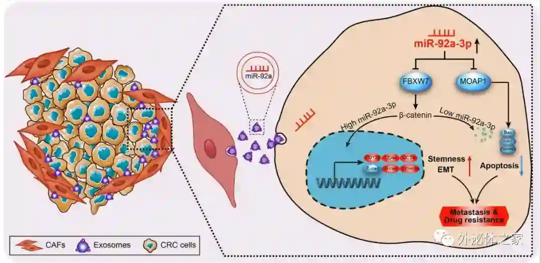 肿瘤相关成纤维细胞(CAF)在肿瘤微环境中对肿瘤进展中起关键作用,然而,结直肠癌转移和化疗耐药与CAF之间的关系仍待明确。近日,来自南方医科大学梁莉课题组的研究人员在Molecular Cancer(IF 7.776)杂志上发表文章,发现CAF分泌的外泌体可促进结直肠癌的转移和化疗耐药,通过抑制CAF外泌体的miR-92a-3p可以逆转肿瘤耐药性。