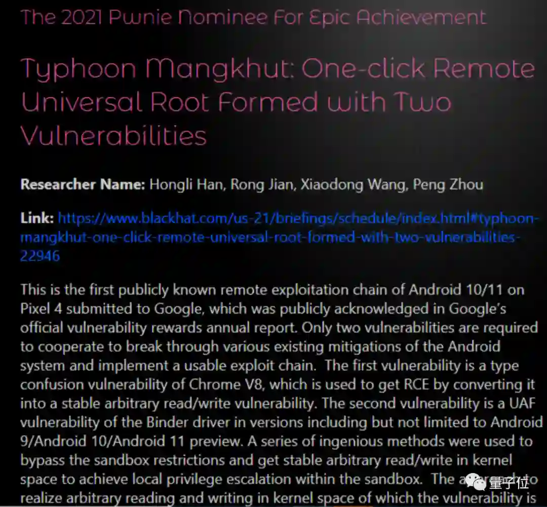 2019年,号称“全球白帽黑客奥斯卡”的The Pwnie Awards中,360成为了中国首个获得最佳提权漏洞奖的企业。