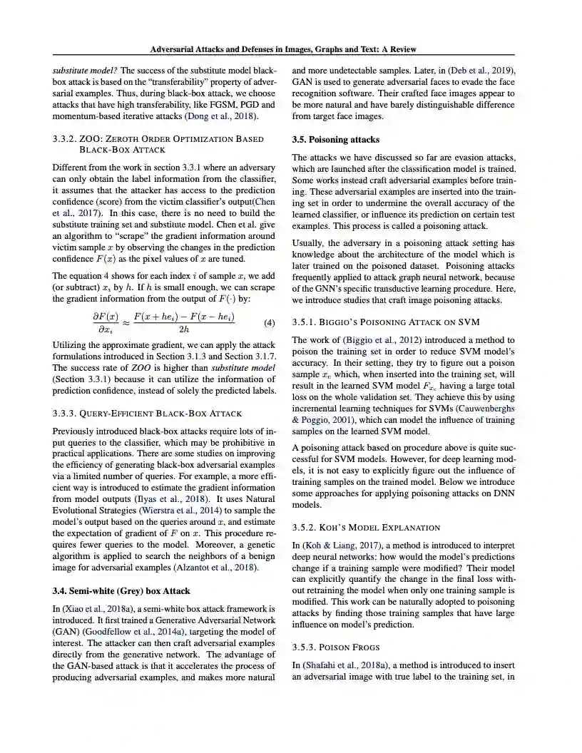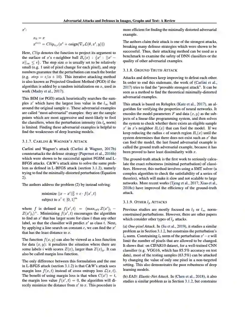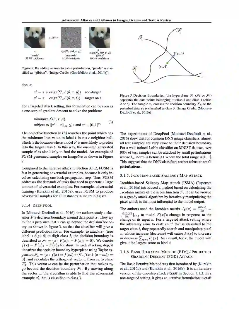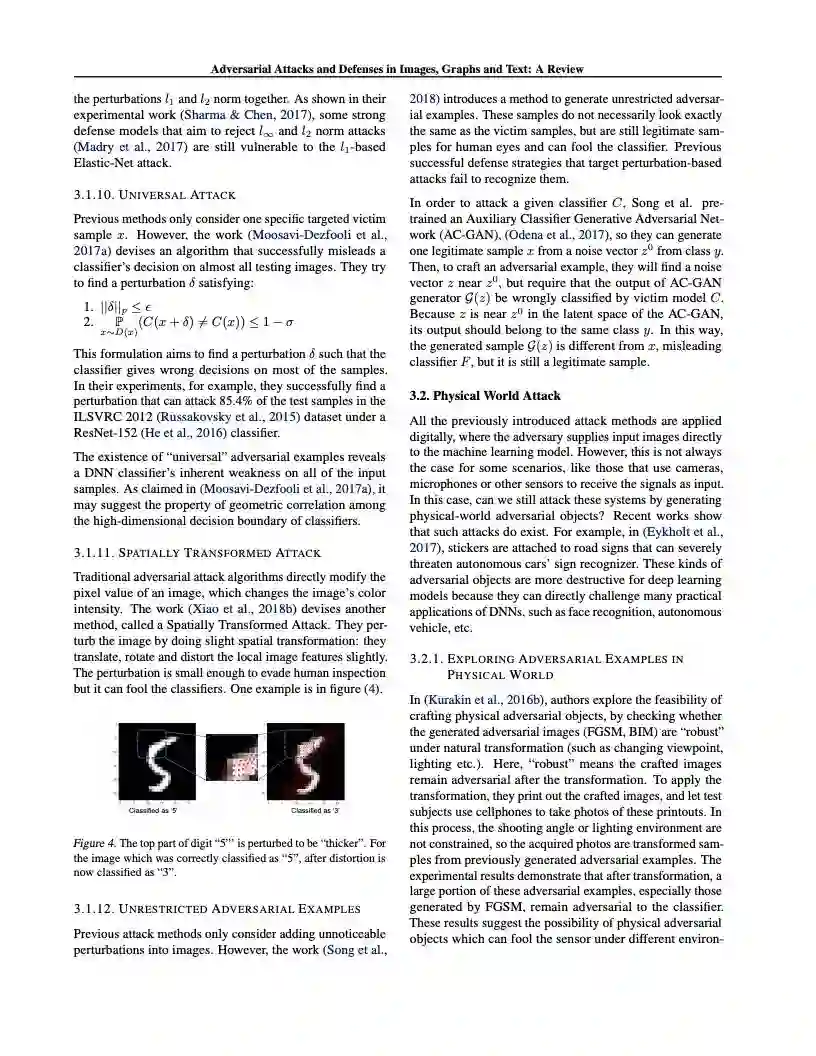 同时,在其他涉及图数据、文本或音频的应用领域,也存在类似的对抗性攻击方案来混淆深度学习模型。例如,仅扰动几个边就可以误导图神经网络(Z¨ugner et al., 2018),而在一个句子中插入拼写错误可以欺骗文本分类或对话系统(Ebrahimi et al., 2017)。因此,在所有应用领域中都存在对抗性的例子,这提醒了研究人员不要在对安全性有要求的机器学习任务中直接采用DNNs。