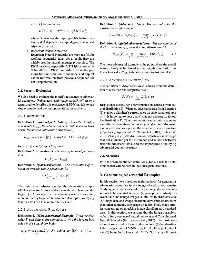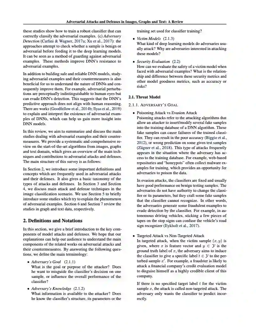 在本文中,我们旨在总结和讨论主要研究涉及对抗样本和他们的防御方法的文章。我们系统和全面的总结了图像数据、图数据和文本数据领域的state-of-the-art对抗攻防算法。本次调查的主要结构如下: 在第二节中,我们将介绍一些在对抗攻击及其防御中经常使用的重要定义和概念。并提供了攻击和防御类型的基本分类。在第3节和第4节中,我们讨论了图像分类场景中的主要攻击和防御技术。我们用第5节来简要介绍一些试图解释对抗性样本现象的研究。第6节和第7节分别回顾了图数据和文本数据的研究。