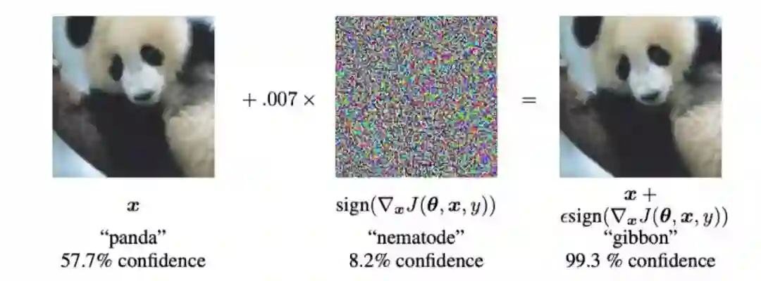 近年来很多工作(Szegedy et al., 2013; Goodfellow et al., 2014b; He et al., 2016b)都已经表明,DNN模型容易受到对抗性样本的攻击,对抗性样本的正式定义为:“对抗性样本是机器学习模型的输入,攻击者故意设计这些输入来导致模型出错。“在图像分类领域,这些含有对抗性的样本是有意合成的图像,看起来几乎与原始图像完全相同(见图2),但可能误导分类器提供错误的预测输出。”