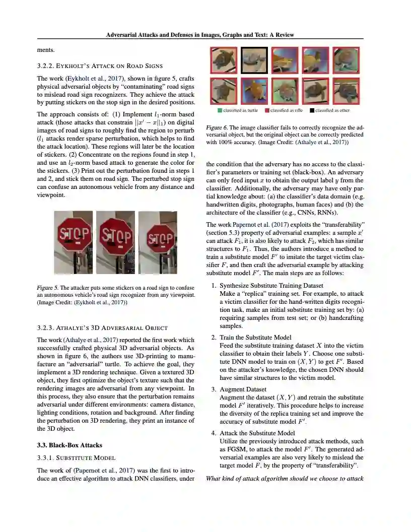 由于这些成就,深度学习技术也被应用于对安全有严苛要求的任务上。例如,在自动驾驶汽车中,深度卷积神经网络(CNNs)被用于识别路标(Cires An et al., 2012)。这里使用的机器学习技术需要高度精确、稳定和可靠。但是,如果CNN模型不能识别路边的“STOP”标志,而车辆继续行驶,那该怎么办呢?这将是一个危险的局面。同样,在金融欺诈检测系统中,企业经常使用graph convolutional networks (GCNs) (Kipf & Welling, 2016)来判断客户是否值得信任。如果有欺诈者为了逃避公司的检测而隐藏自己的身份信息,将会给公司带来巨大的损失。因此,深度神经网络的安全问题成为人们关注的焦点。