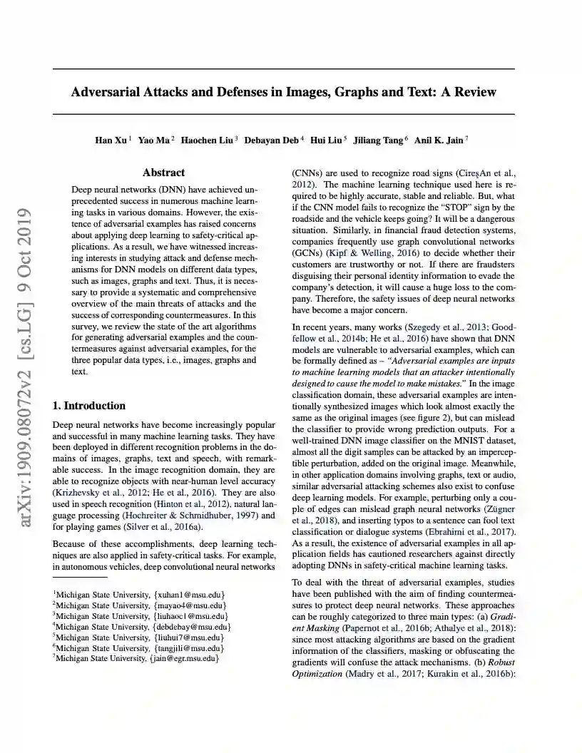 【导读】深度神经网络(DNN)在不同领域的大量机器学习任务中取得了前所未有的成功。然而,对抗性例子的存在引起了人们对将深度学习应用于对安全性有严苛要求的应用程序的关注。因此,人们对研究不同数据类型(如图像数据、图数据和文本数据)上的DNN模型的攻击和防御机制越来越感兴趣。近期,来自密歇根州立大学的老师和同学们,对网络攻击的主要威胁及其成功应对措施进行系统全面的综述。特别的,他们在这篇综述中,针对性的回顾了三种流行数据类型(即、图像数据、图数据和文本数据)。