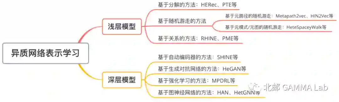 异质网络表示学习兴起于最近两三年,但是发展迅猛。如图所示,将已有的方法大致按照浅层模型和深层模型分类。