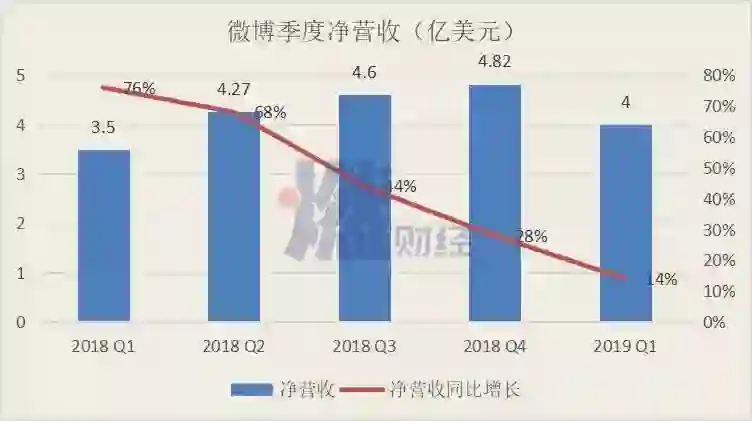 对比微博近5个季度的净营收数据,在连续4季度上涨之后,2019年Q1首次环比减少17%,迎来负增长。同比增速也呈现持续下降趋势,从2018年Q1的76%一路下滑至2019年Q1的14%。该指标在2018年Q4首次低于30%,2019年Q1仅为2018年Q4的一半。