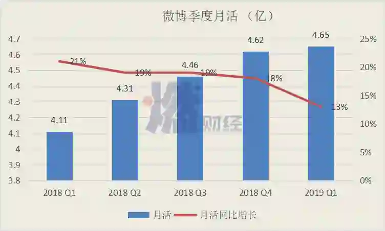 一位社交行业分析师对燃财经表示,月活跃用户规模和使用时长是衡量媒体平台广告价值的重要依据。微博月活增速连续5季度持续下降,截至2019年Q1,微博的月活跃用户同比增速下降至13%,创历史新低。