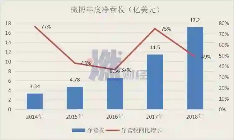 对历年净营收同比增速进行对比,除2017年以外,其余年份均呈现下降趋势。2014年,微博上市当年,净营收同比增速为77%,上市第二年降到43%,2016年进一步降到37%。2017年有短暂回升之后,2018年又降到49%。