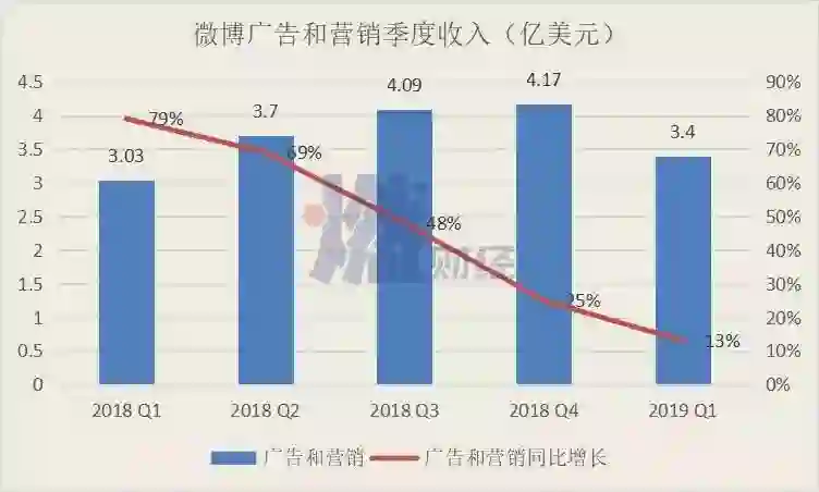 微博2019年Q1的广告和营销收入为3.4亿美元,占总营收的85%。对一家严重依赖广告收入的公司,微博近5个季度以来,广告和营销的同比增速一直在下滑,2019年Q1的广告和营销收入同比增长仅为13%,为连续5季度最低。